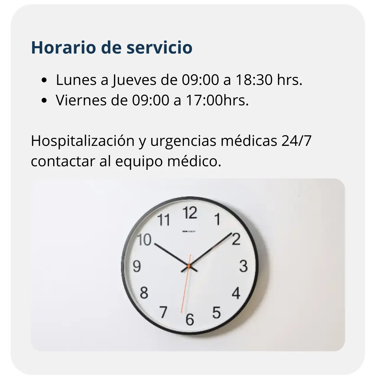 Hospitalización y urgencias médicas 24/7 contactar al equipo médico.