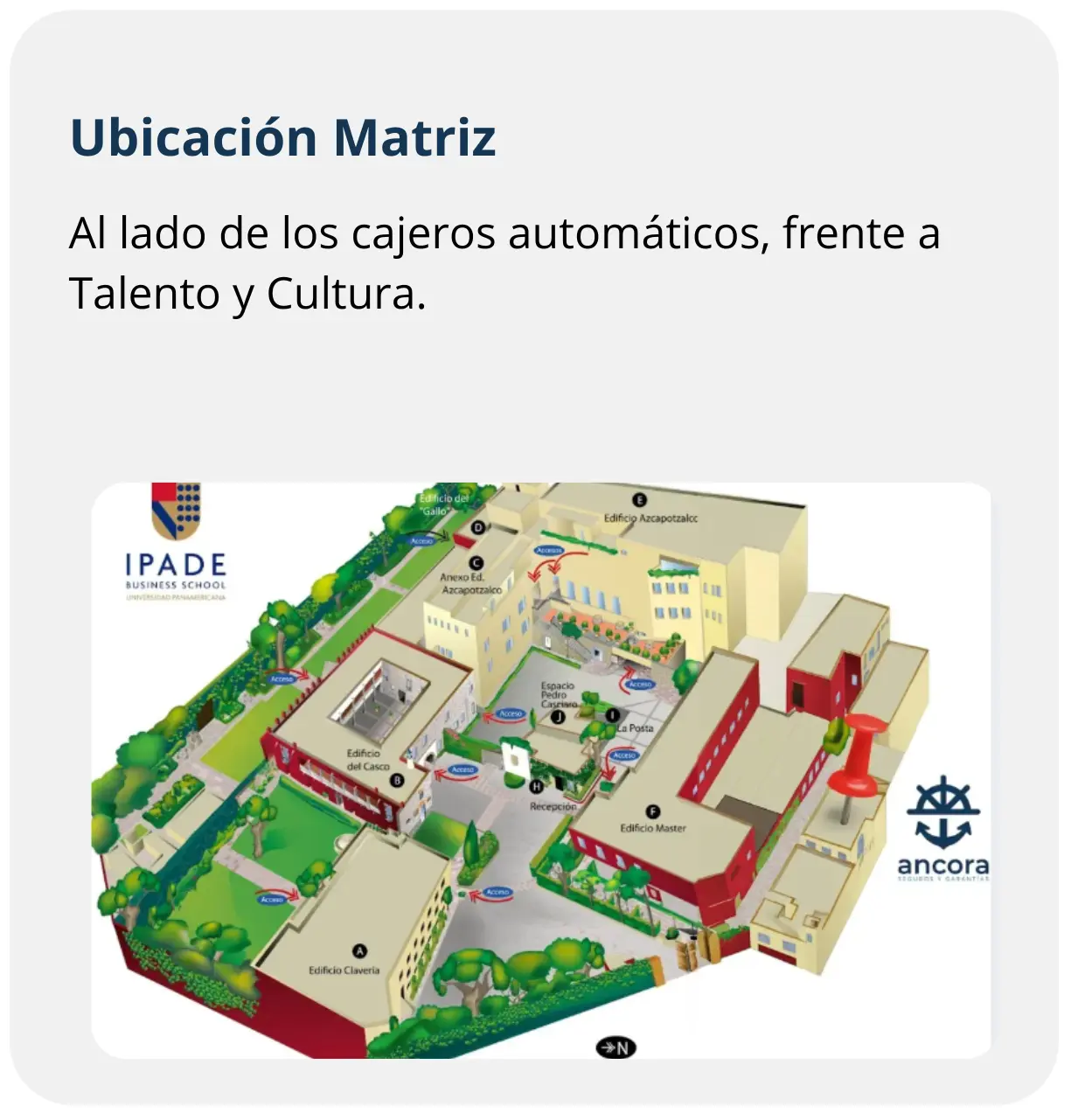 Estamos localizados a un costado de los cajeros automáticos, frente a las oficinas de Talento y Cultura.